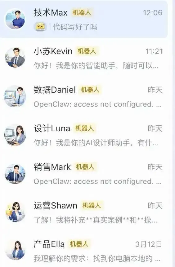 在实际聊天场景中,这些助理会主动互动:技术Max 会直接问“代码写好了吗?”,小苏Kevin 随时准备提供帮助,数据Daniel、设计Luna 等也能根据指令处理各自专业任务。我只需要通过 Skills 的自定义 SOP,用自然语言描述每个助理的角色、权限和流程,龙虾就能自动生成对应的 SKILL.md 和执行逻辑,完全零代码。