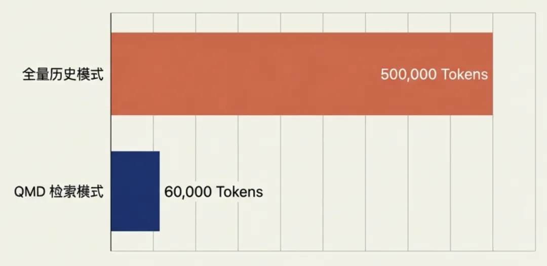 全量历史模式:每轮消耗 50,000,10 轮就是 500,000 QMD 检索模式:即时窗口 5,000 + 检索召回 1,000 = 每轮 6,000,10 轮只要 60,000