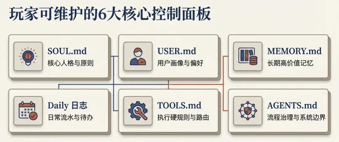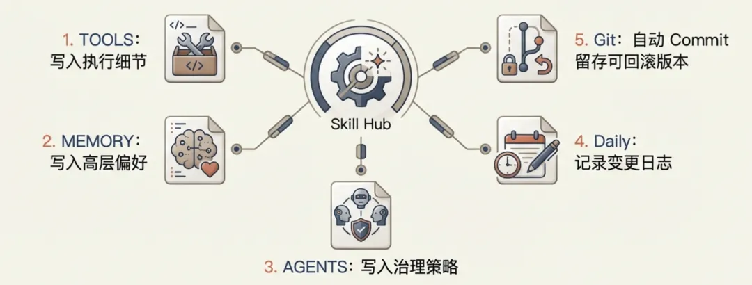 TOOLS 写执行细节 MEMORY 写高层偏好 AGENTS 写治理策略(必要时) daily memory 记变更日志 git commit 留可回滚版本