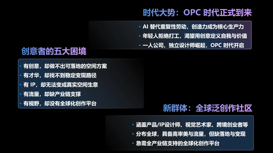 与此同时,OPC(一人公司)模式也在OpenClaw的热潮下持续释放活力。此次奥创引擎接入OpenClaw,除了将为超级创业者群体破解“无工具、无平台、无产业链支持”的“三无”困境,打通创意到商业的全链路,激活OPC创作者生态活力,还将为文旅、乡创、商业空间等领域创意落地与价值变现注入新动能。