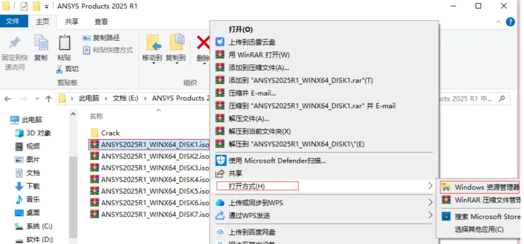 23.返回之前解压的“ANSYS Products 2025 R1”文件夹,选中“ANSYS2025R1_WINX64_DISK1”iso文件,鼠标右键选择“装载”(如果没有“装载”选项的可以右键选择“打开方式—Windows资源管理器”打开)