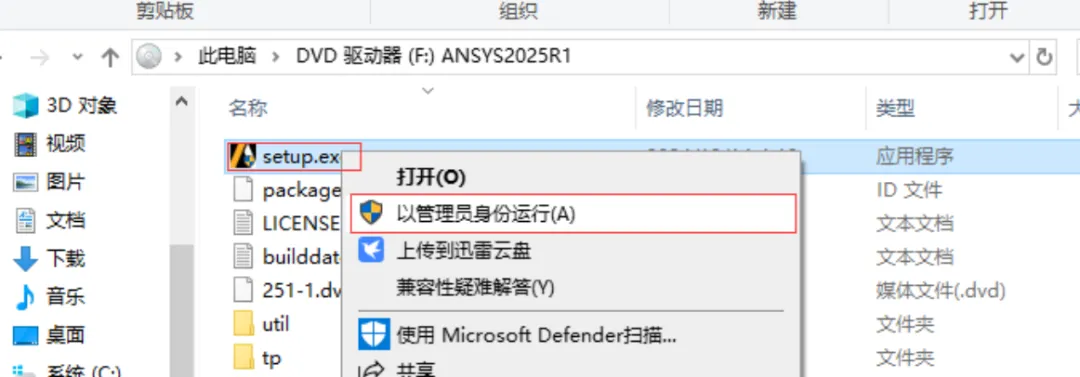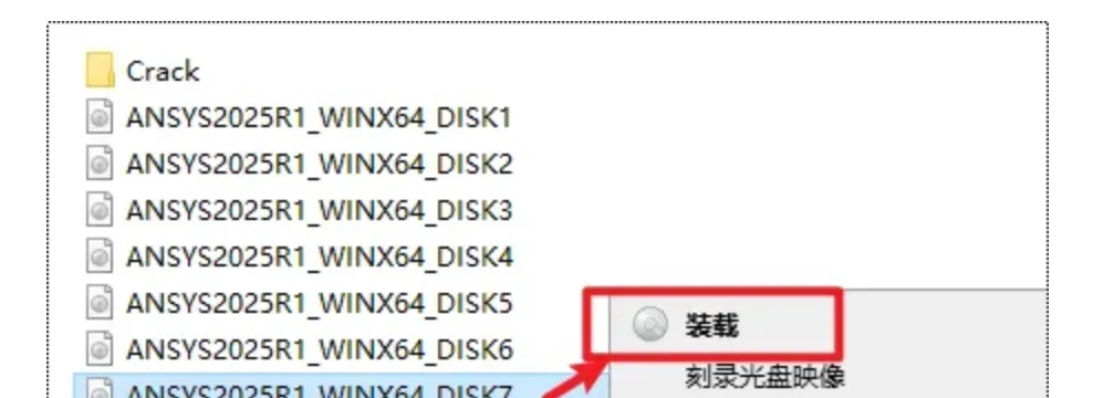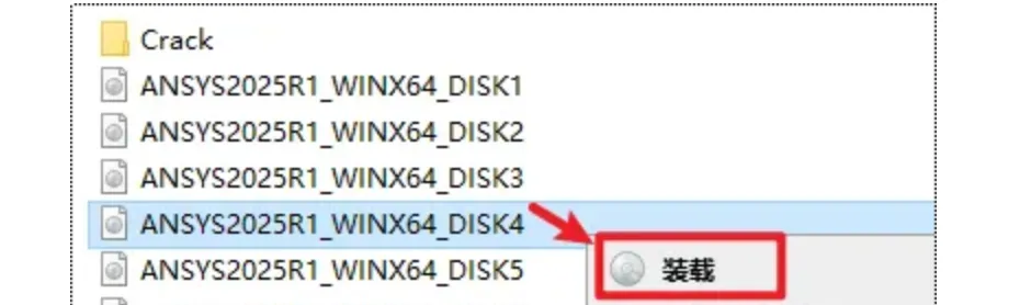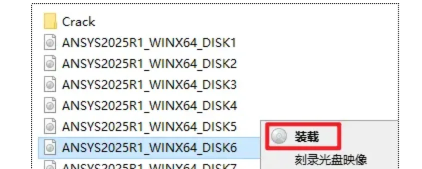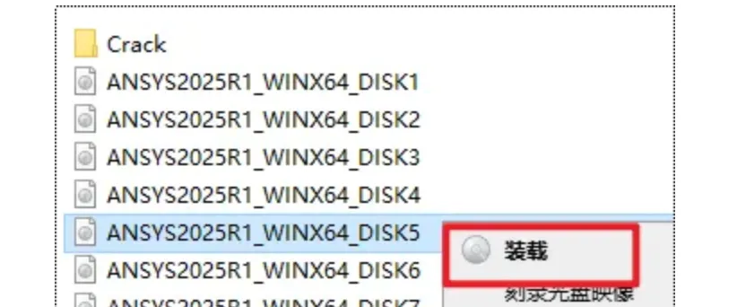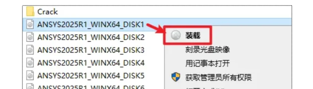 2.打开解压出来文件夹,选中“ANSYS2025R1_WINX64_DISK1”文件,右键选择“装载”(如果没有“装载”选项的可以右键选择“打开方式—Windows资源管理器”打开)