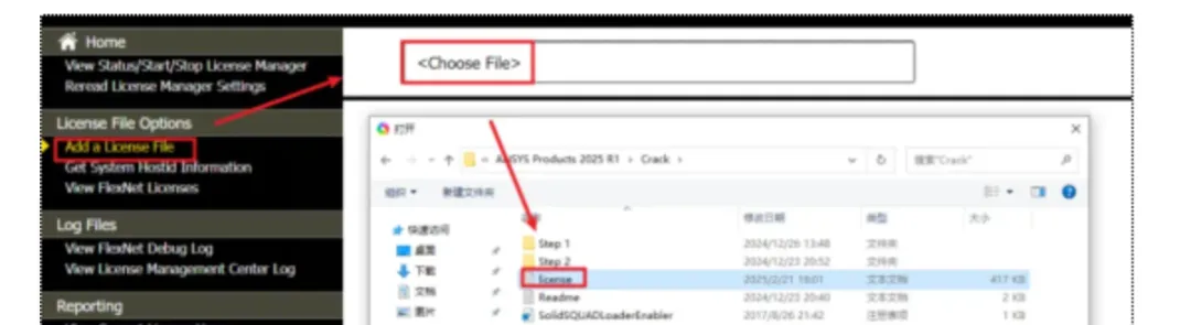 20.返回证书管理中心“ANSYS License Manager Center“界面,点击"Add a License File" ,点击"Choose File" ,找到并选中"license.txt" 文件,点击 "打开"