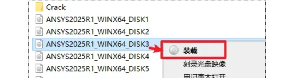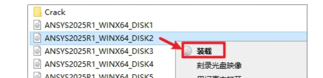 37.返回安装文件夹,选中“ANSYS2025R1_WINX64_DISK2”iso文件,右键选择“装载”