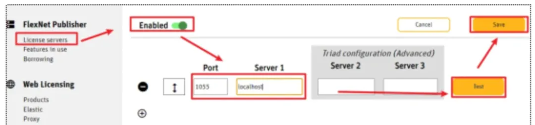 68.选择“Lisence servers”,点击“Enabled“旁边的打开按扭,在“Port”下面的框里输入:1055,在“Server1”下面的框里输入:localhost,点击“Test”,旁边出现绿色的勾,点击”Save“保存