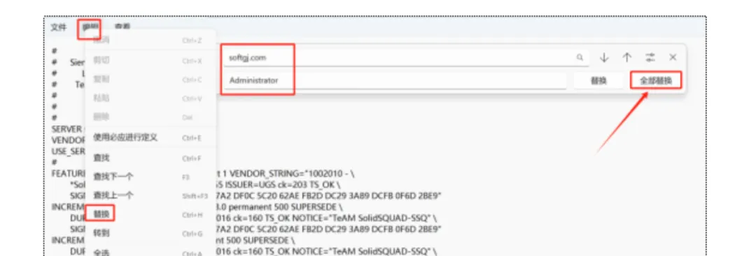 10.点击【编辑】选择【替换】,输入查找内容【softgj.com】,在【替换为】处输入自己的“计算机全名”,点击【全部替换】。