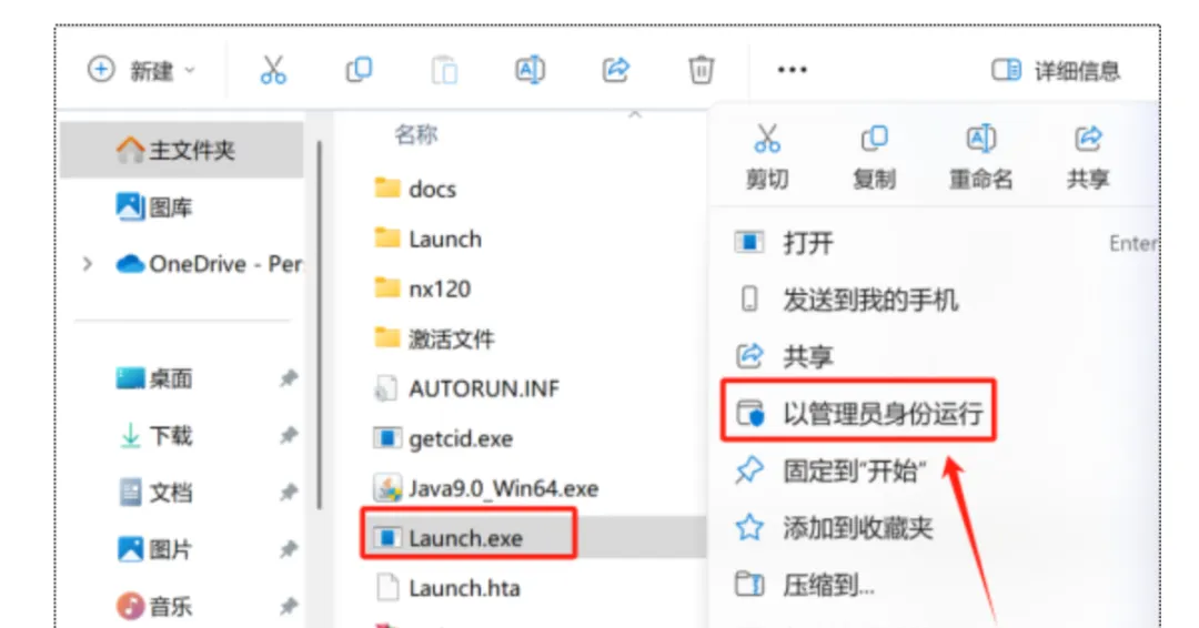 21.打开安装包解压后的【UG NX12.0(64bit)】,鼠标右击【Launch】选择【以管理员身份运行】。