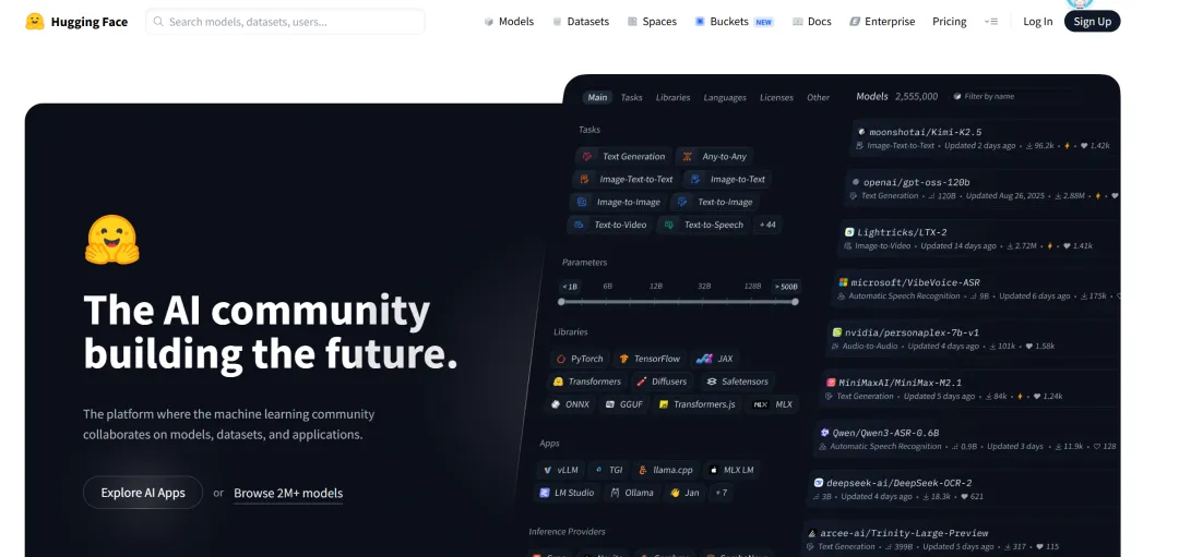 HuggingFace(抱脸):全球最大的模型仓库,托管了超过210万个模型,几乎你能想到的所有知名模型(Llama、GPT、BERT等)都能在这里找到。不过服务器在国外,国内访问有时会慢。