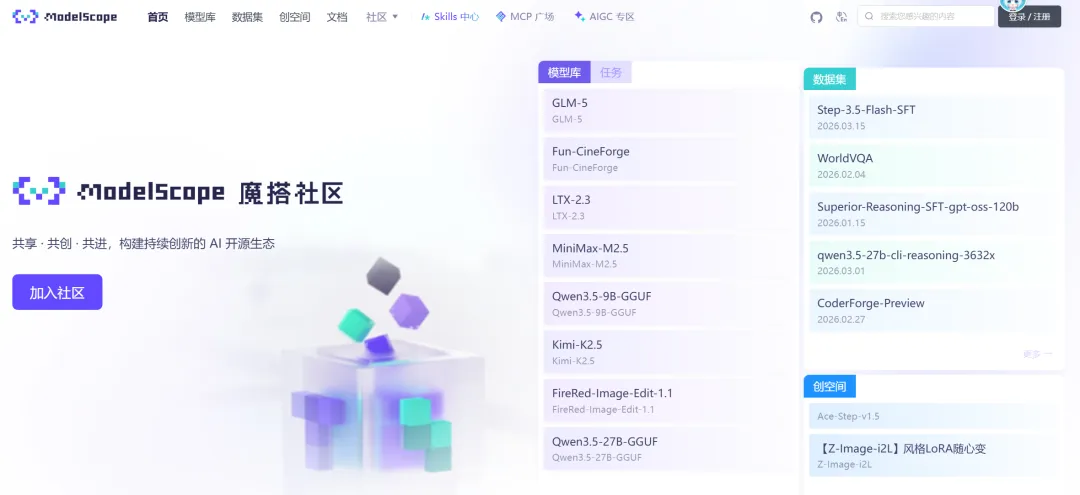 ModelScope(魔搭社区):阿里云推出的国内平台,中文友好,下载速度快,而且有很多针对中文优化的模型(如通义千问Qwen系列、ChatGLM等)。