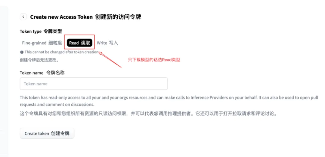 点击New token,选择Read权限(只读即可,日常下载用这个最安全),起个名字(比如“MyLaptop”),然后点击生成。