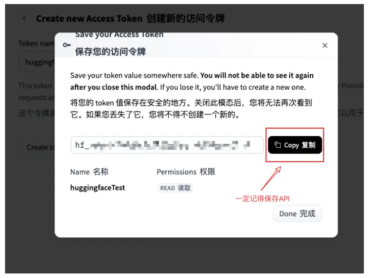 立即复制并保存好这个以hf_开头的Token,关闭窗口后就再也看不到了!