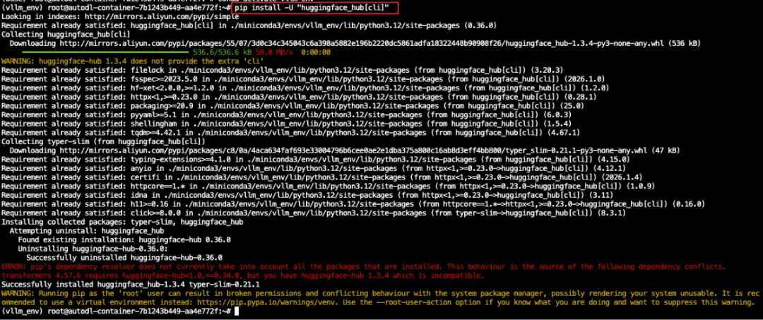 # 安装huggingface_hub(包含命令行工具)pip install -U "huggingface_hub[cli]"# 执行登录命令,粘贴刚才保存的Token(粘贴时屏幕不会显示,直接回车即可)huggingface-cli login# 验证登录成功huggingface-cli whoami # 应该显示你的用户名