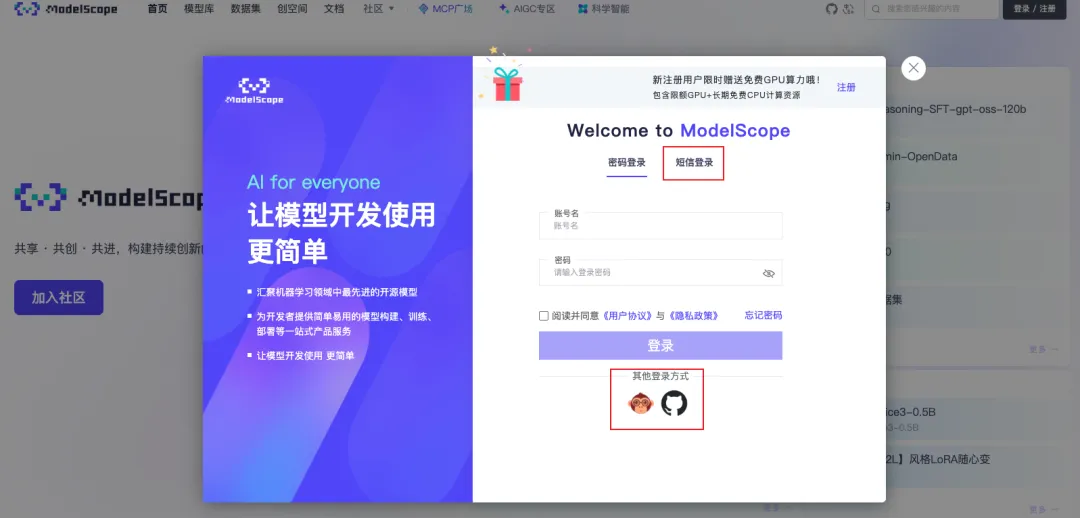 访问 ModelScope官网 ,点击右上角“登录/注册”。