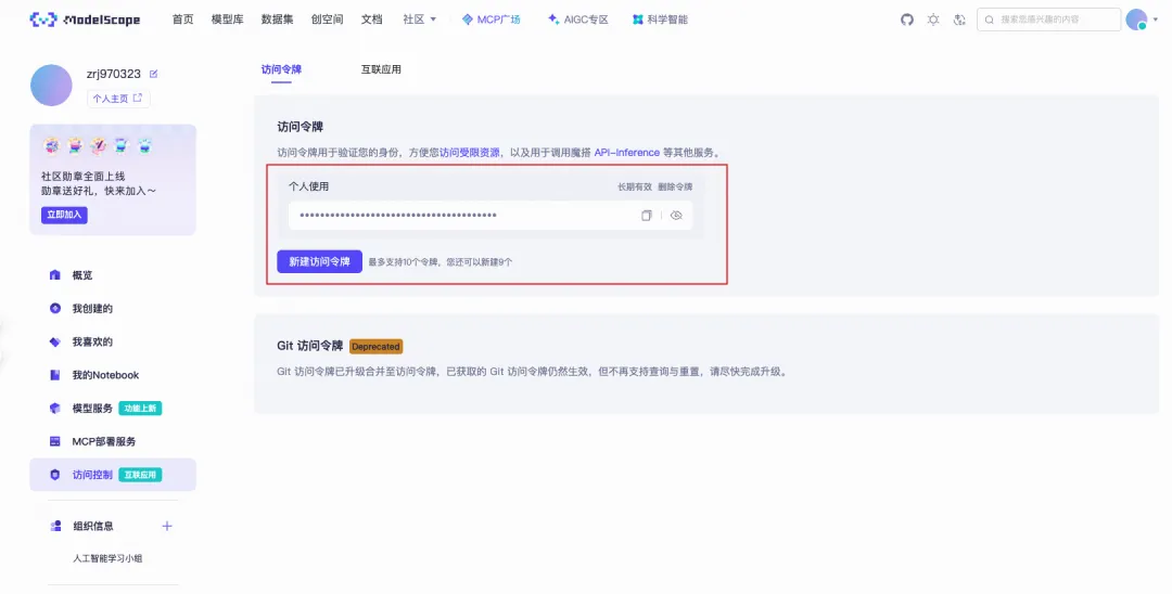 鼠标悬停在右上角头像 → 个人中心 → 访问令牌。