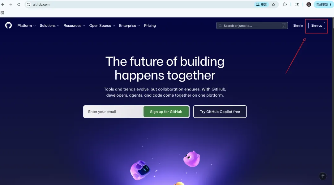 访问 GitHub ,点击 Sign up 注册(推荐使用Gmail/Outlook邮箱)。