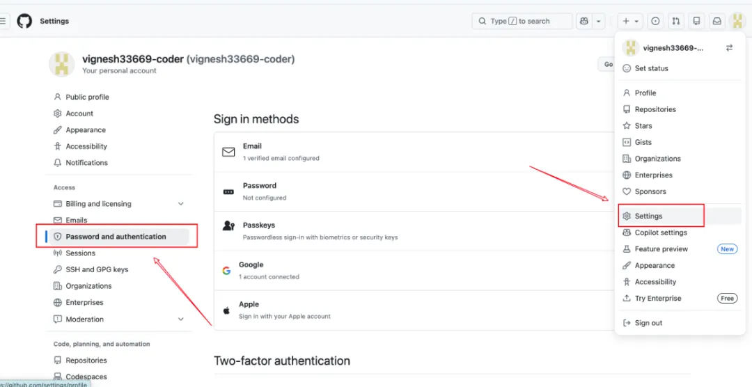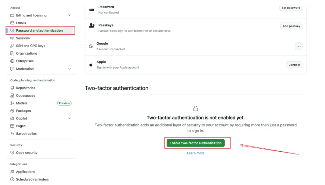开启2FA:头像 → Settings → Password and authentication → Enable two-factor authentication,用手机Authenticator APP扫描二维码,并保存好恢复码。