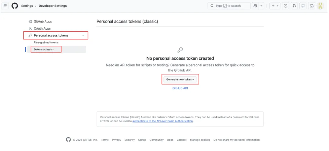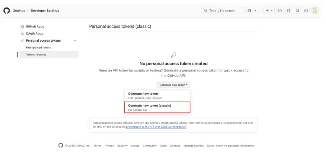 头像 → Settings → Developer settings → Personal access tokens → Tokens (classic) → Generate new token (classic)。