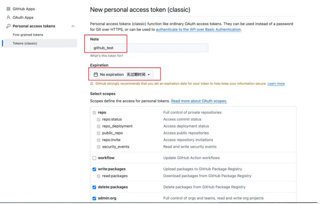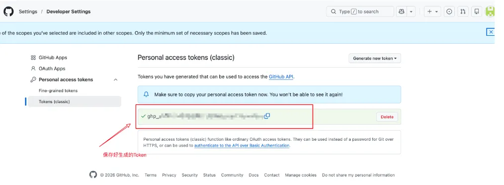 repo权限(读写仓库),设置有效期,生成后立即复制保存(以ghp_开头)。