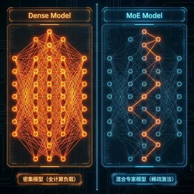 以 DeepSeek-V3 为例:每次推理只激活 37B 参数,计算速度接近一个 37B 的 Dense 模型。但它的 671B 总参数在 FP16 下需要约 1.3TB 的存储空间——这些参数必须全部加载到内存或显存中,因为门控网络在每一层都可能选择不同的专家,你无法提前知道哪些专家会被用到。
