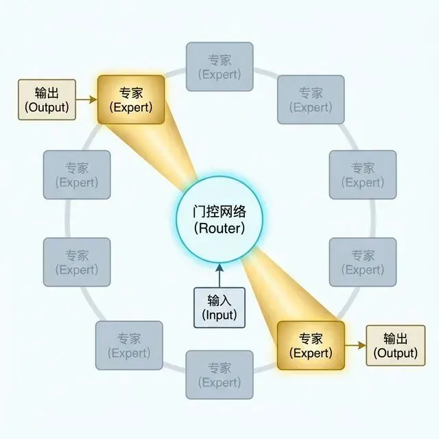 专家(Experts):每个专家本质上就是一个独立的小型 FFN。不同的专家在训练过程中会自然地习得不同的知识模式——有的擅长处理语法结构,有的擅长代码逻辑,有的擅长数学推理。