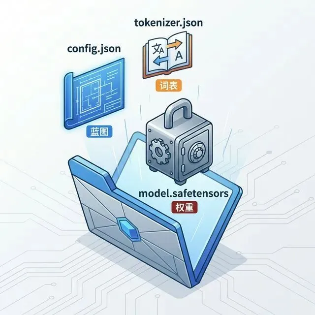 在3.2中,我们从宏观角度理解了"架构"与"权重"的关系。现在,让我们进入更具体的层面:当你从 HuggingFace 或 ModelScope 下载一个模型后,文件夹里那一堆文件,具体如下: