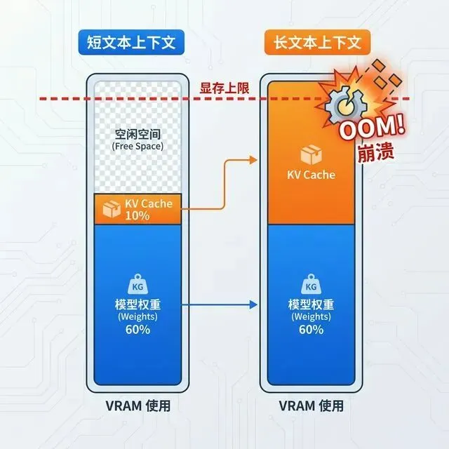 🔥 避坑指南:不要被模型宣传的"支持 128K 上下文"所迷惑。实际能用多长的上下文,取决于你的显存余量。公式:可用上下文长度 ≈ (总显存 - 模型显存) / 每 1K token 的 KV Cache 大小