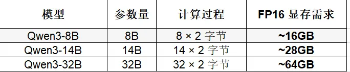 INT4:每参数0.5字节 → 7B ≈ 3.5GB,14B ≈ 7GB,32B ≈ 16GB。
