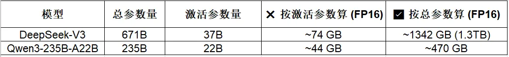 ⚠️ 常见误区:看到 DeepSeek-V3 "激活参数 37B"就以为它和 Qwen3-32B 的显存需求差不多。实际上,DeepSeek-V3 的总参数量是 671B,即使使用 INT4 量化也需要约 230GB 的存储空间。MoE 模型的显存/内存需求,永远由总参数量决定。