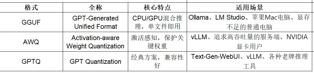 你会看到模型文件有不同的后缀,比如GGUF、AWQ、GPTQ,它们就像是不同的“压缩算法”,各有侧重,适用于不同的场景。