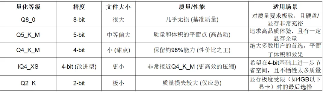 GGUF文件的后缀(如Q4_K_M)代表了不同的量化等级,你可以理解为“压缩率”: