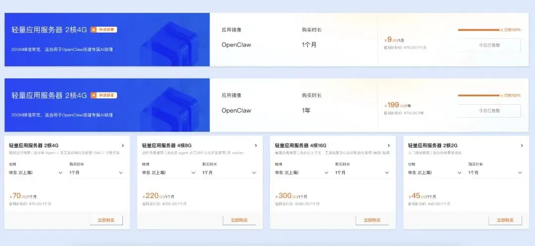 2、购买轻量应用服务器,推荐2核2G及以上配置,镜像选择【OpenClaw】镜像,选择完成提交订单并完成支付,系统会自动完成部署。