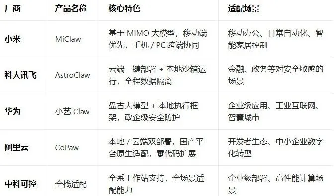 面对OpenClaw热潮,国内科技巨头迅速推出适配自家平台的 “龙虾饲养环境”,抢占 AI 智能体生态高地: