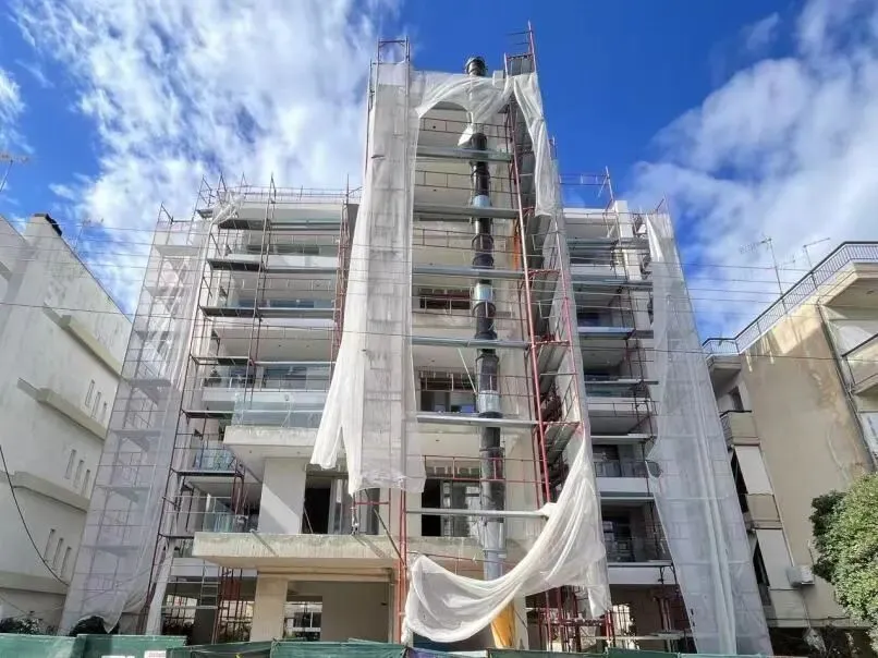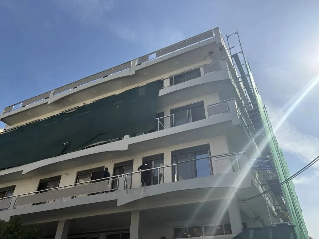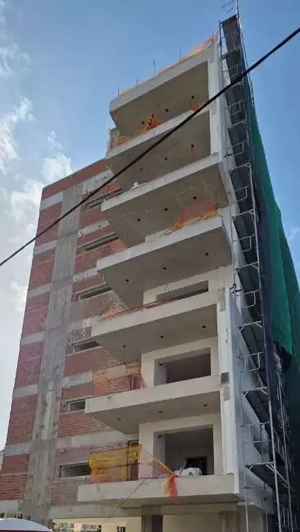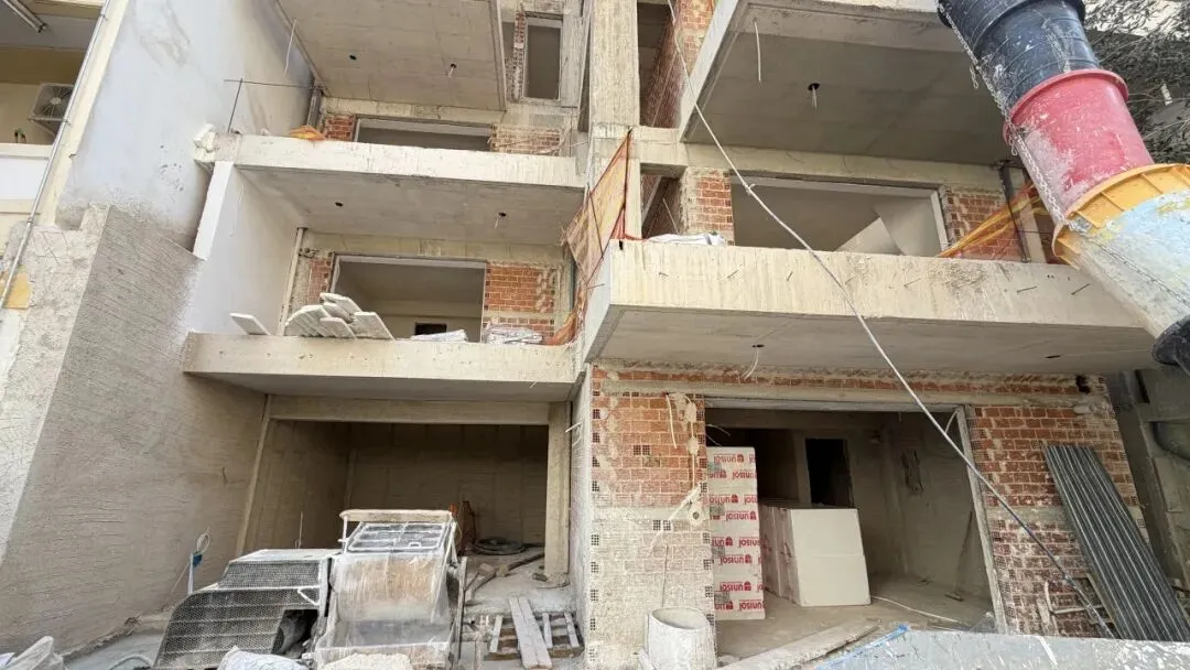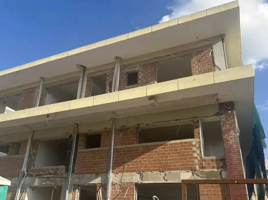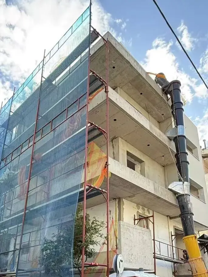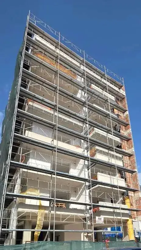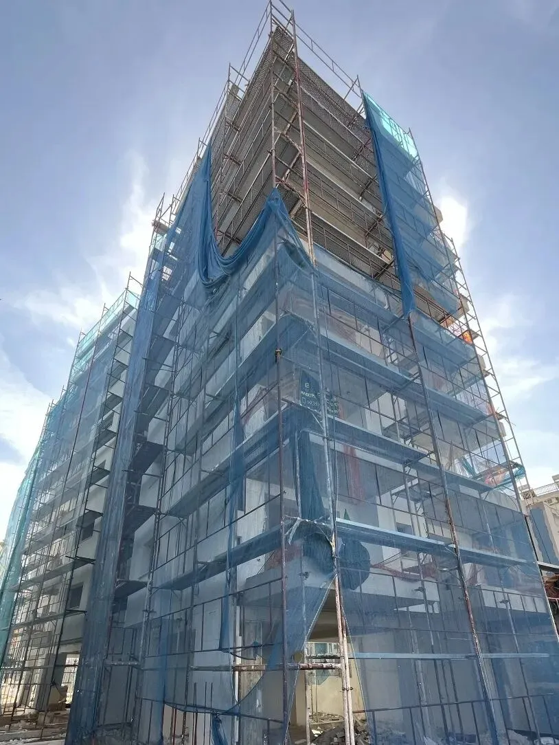 建筑主体结构框架已完工,保温层,防水层准备进场安装,外墙水泥砂浆作业同步进行。