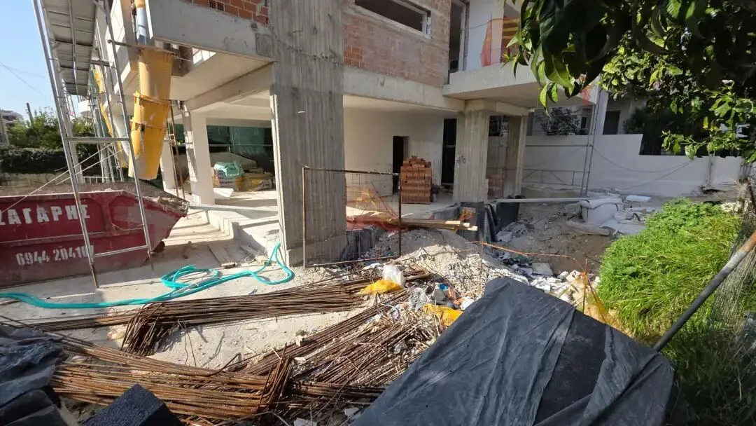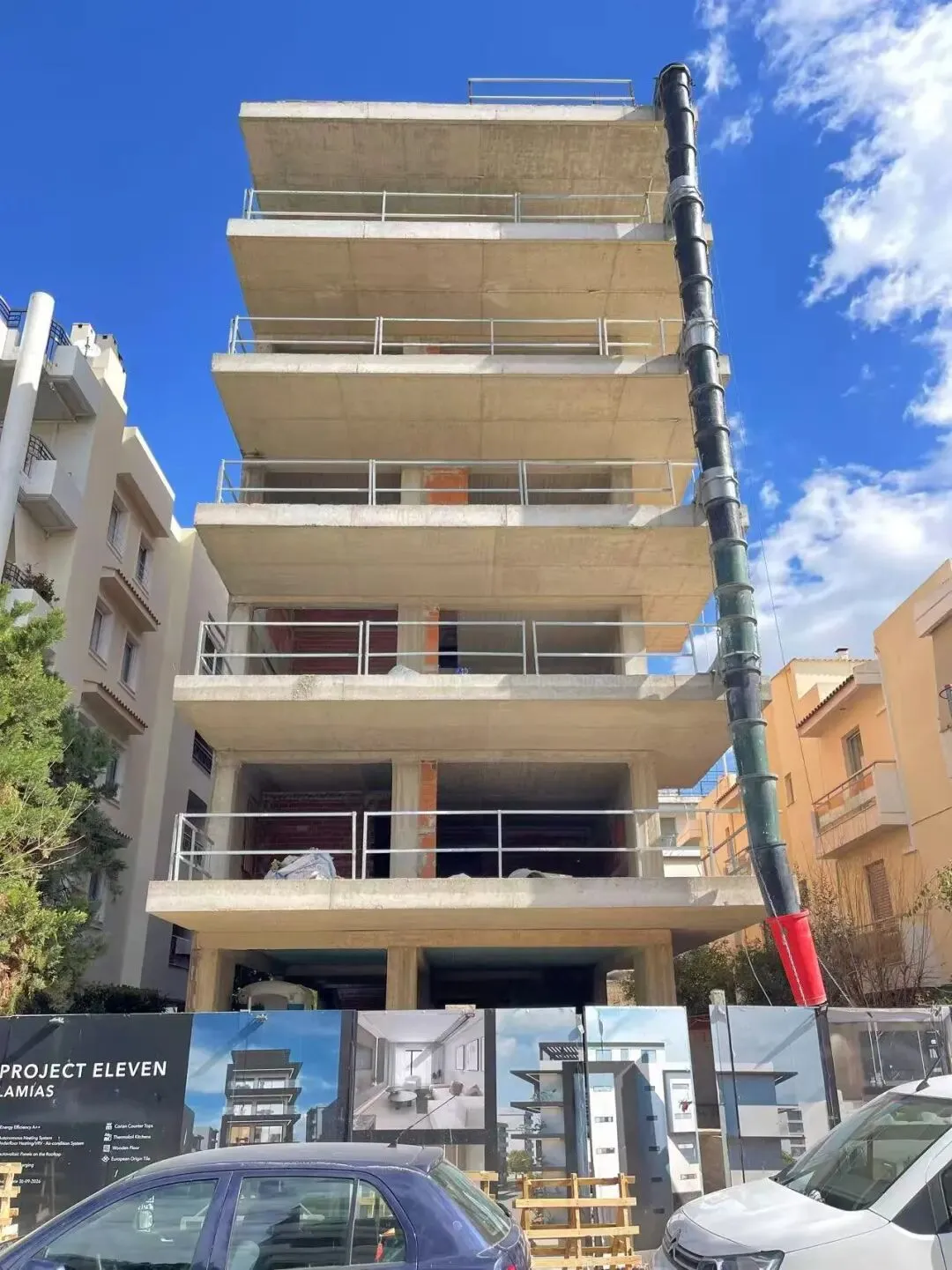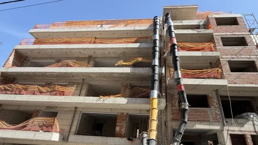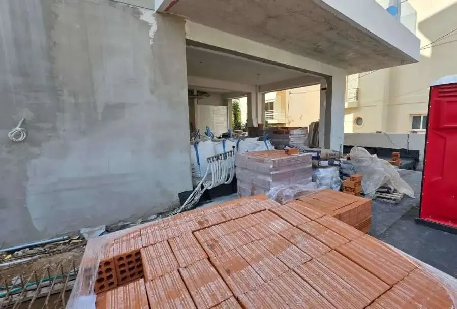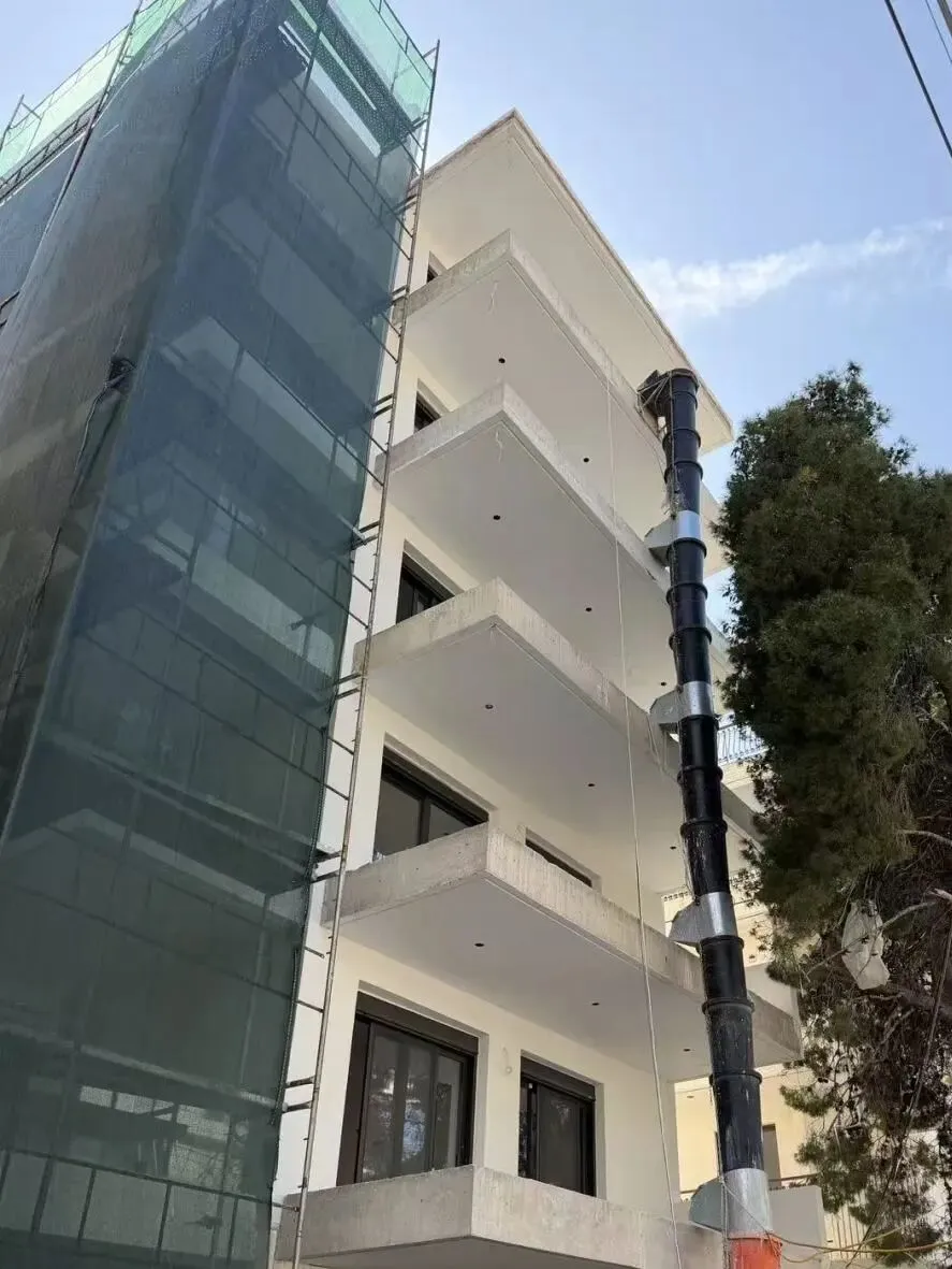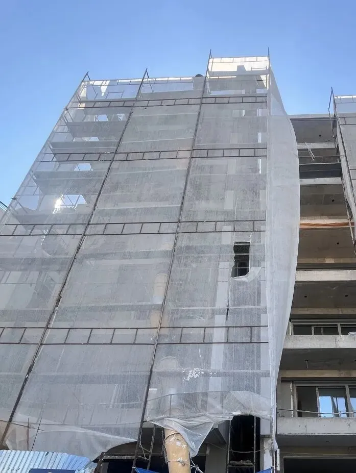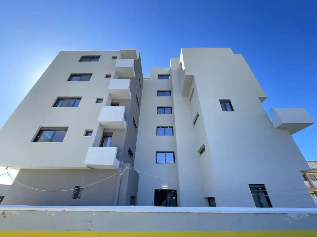 建筑主体结构框架已完工,保温层,防水层准备进场安装,外墙水泥砂浆作业同步进行。