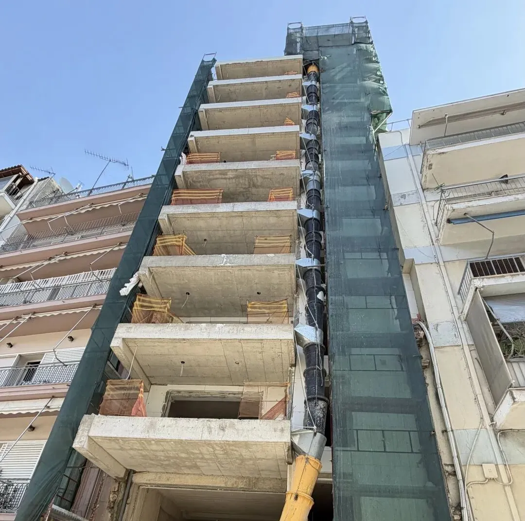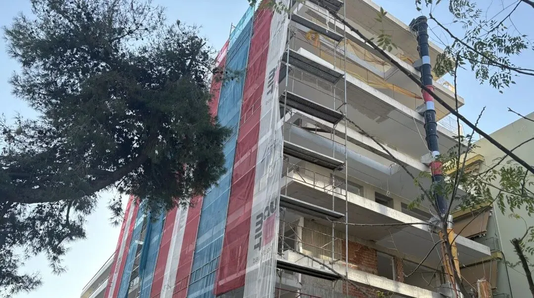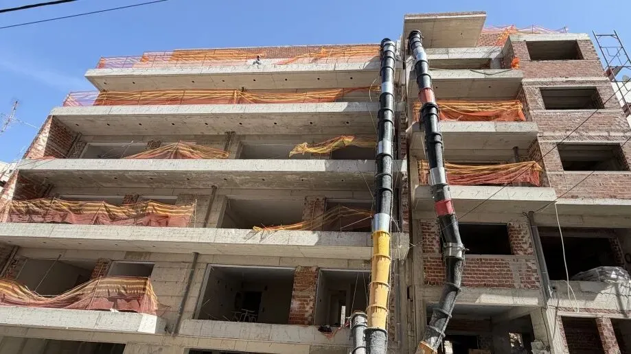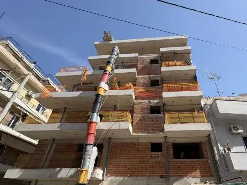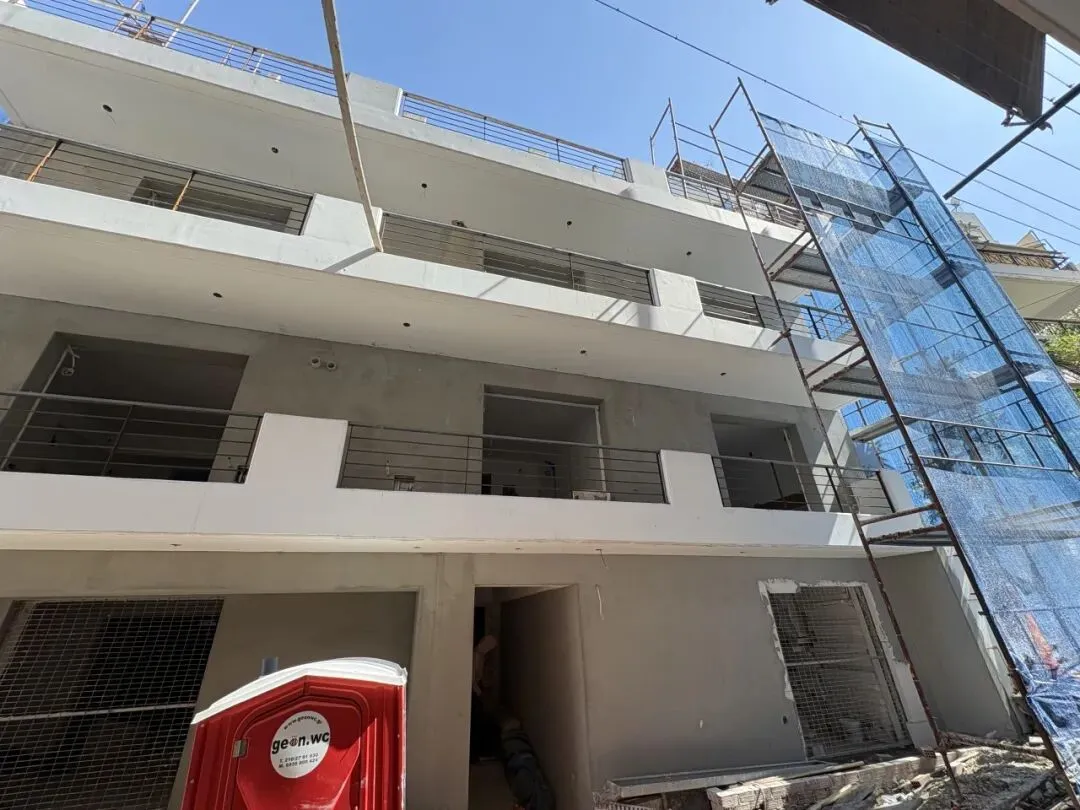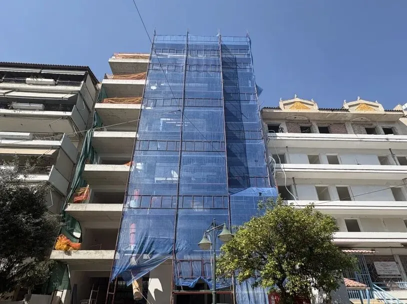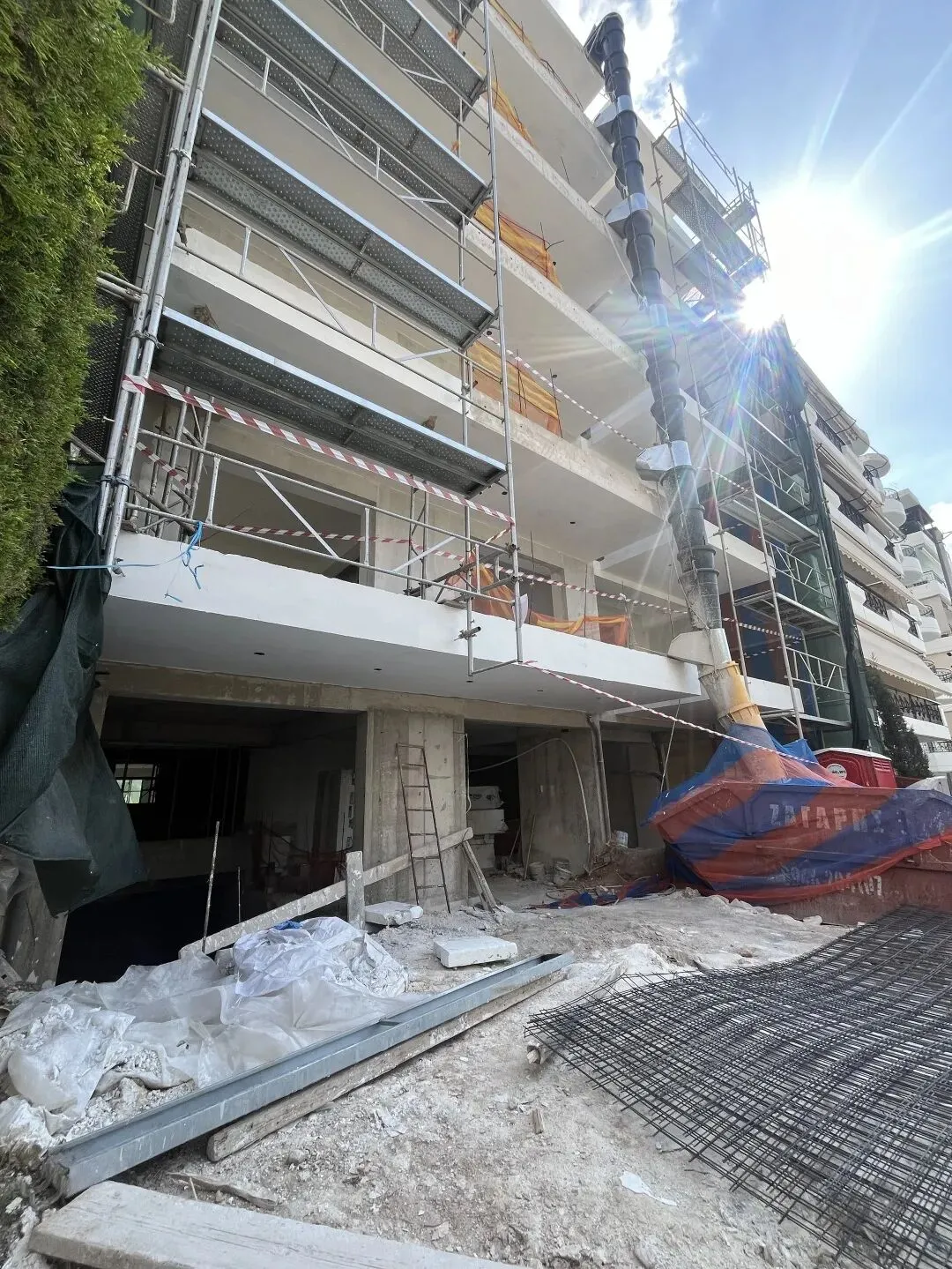 建筑主体结构框架已完工,保温层,防水层准备进场安装,外墙水泥砂浆作业同步进行。