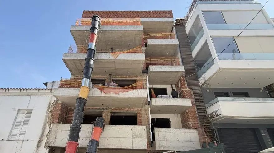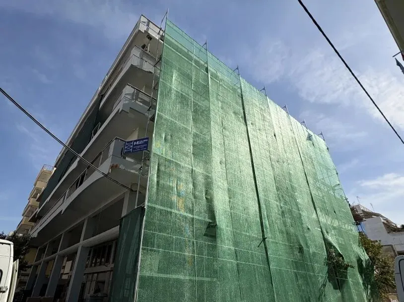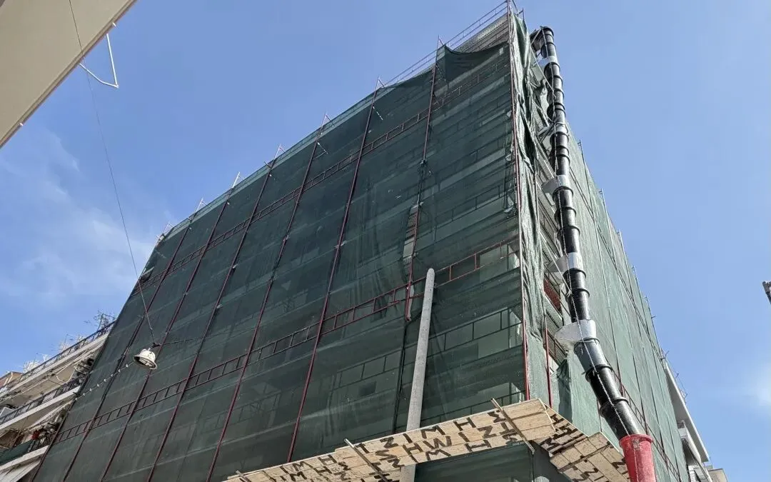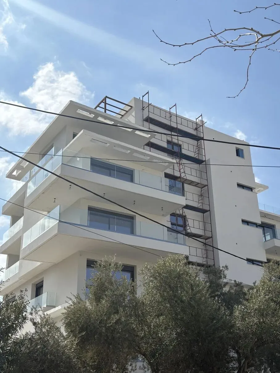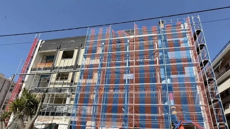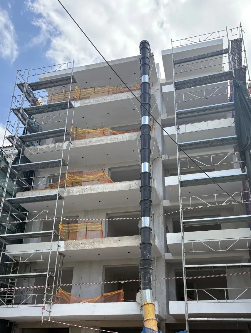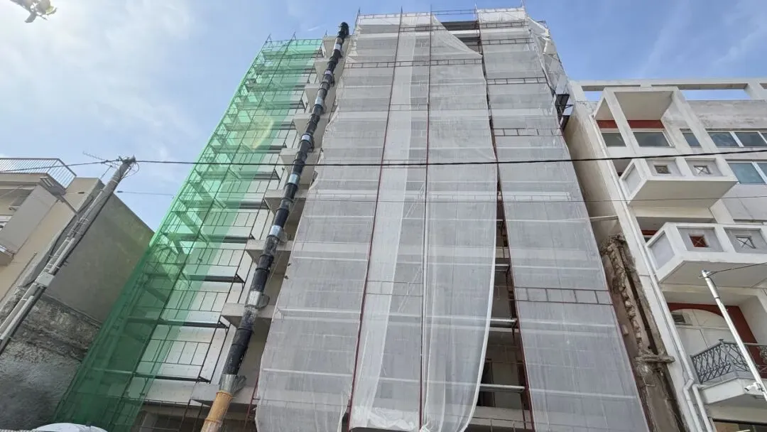 建筑主体结构框架已完工,保温层,防水层准备进场安装,外墙水泥砂浆作业同步进行。