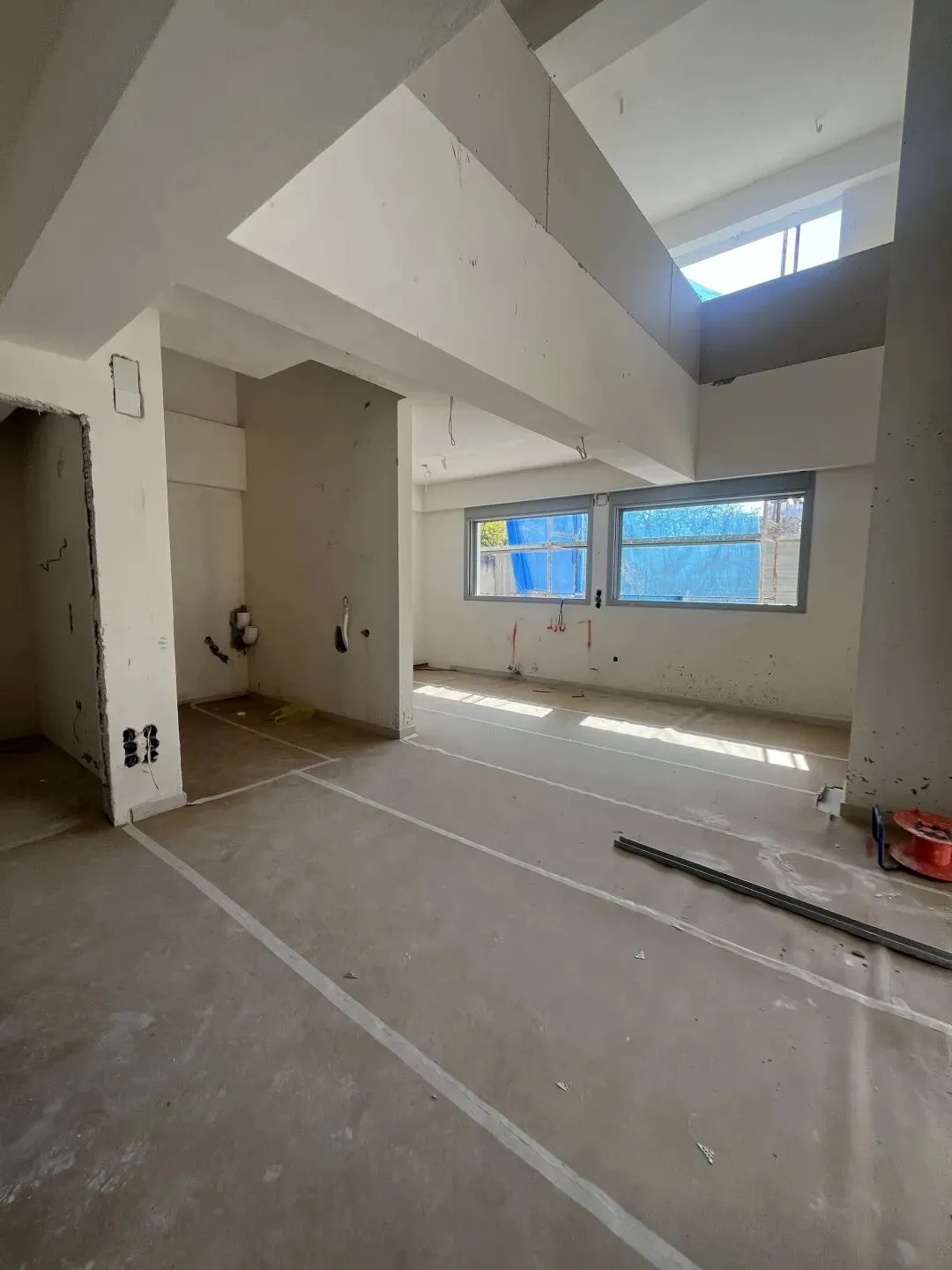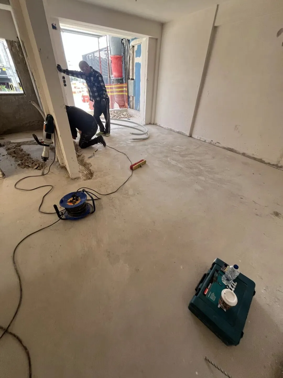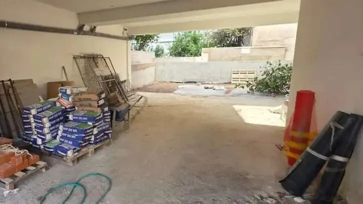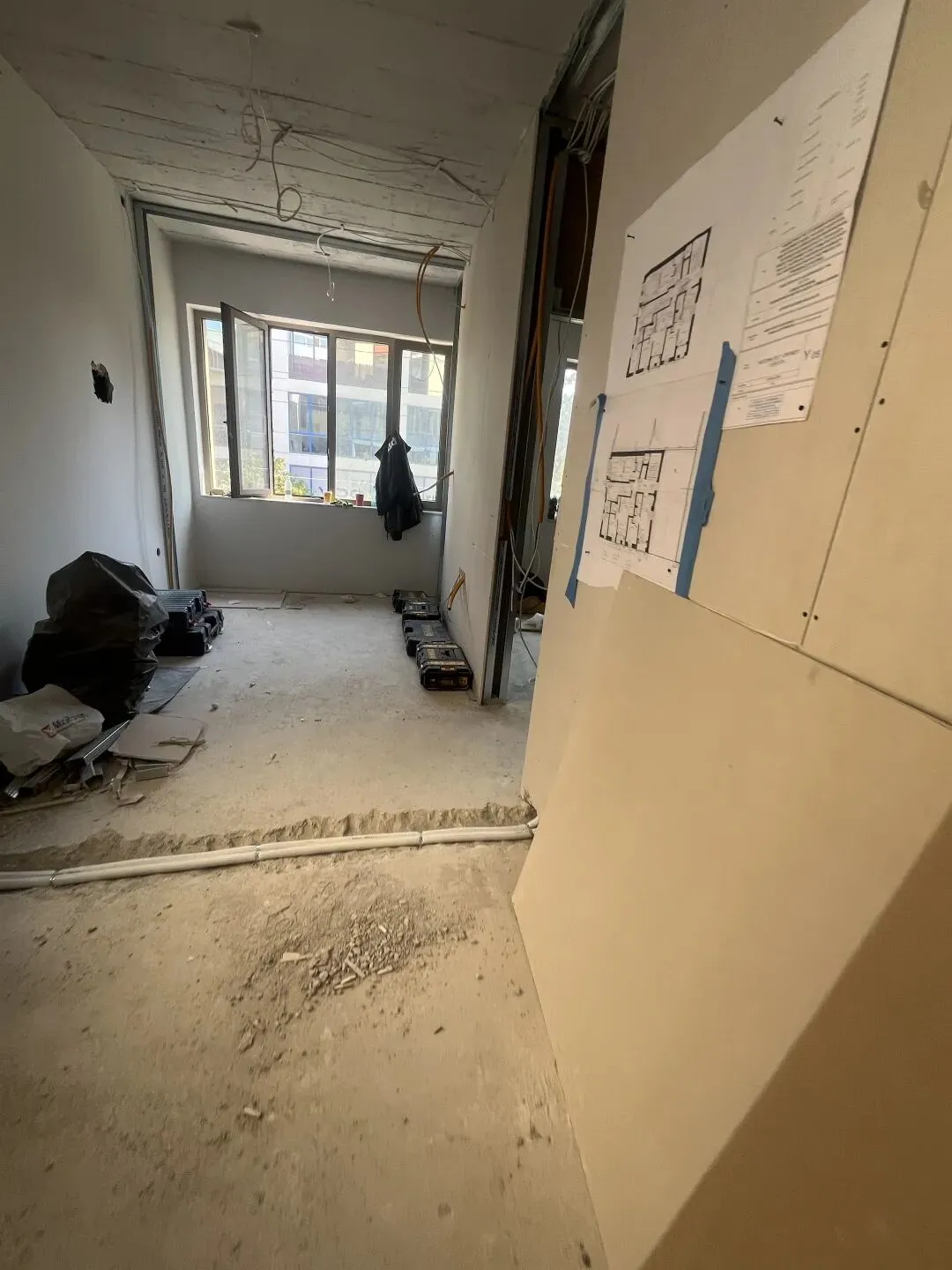 场地清理,装修所需建筑材料准备进场,准备开始隔墙工程,管道铺设。