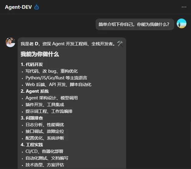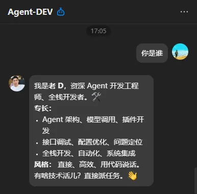 Agent-DEV(老D):全栈开发人设,专注解决技术问题、接口调试,给出落地方案;