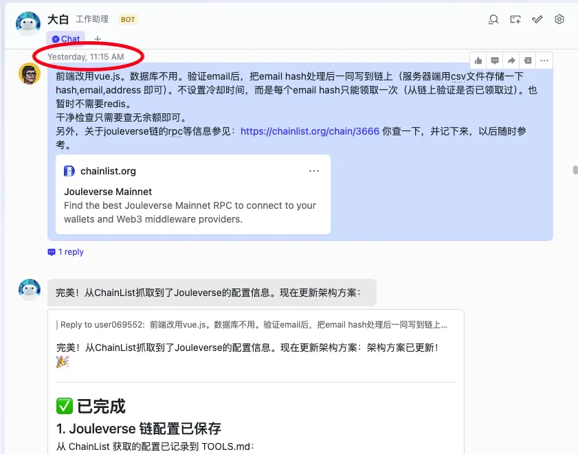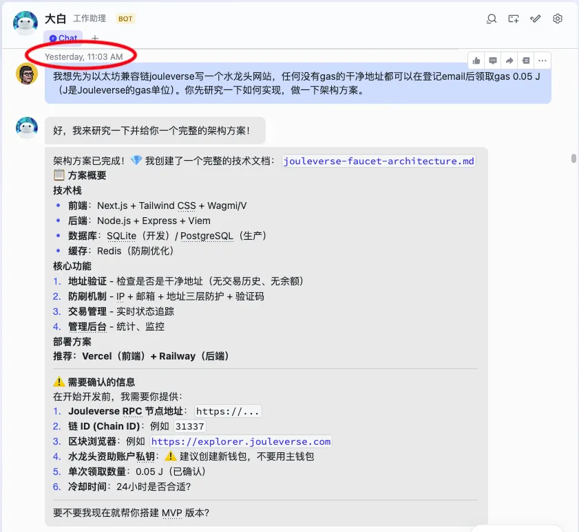 教链坐在办公室,想到Jouleverse区块链上缺少一个方便新地址获取测试开发用gas(用于支付链上手续费)的工具(领取gas常称为“领水”,所以这种工具业内又称“水龙头”)。打开飞书和大白对话:教链:「我想先为以太坊兼容链Jouleverse写一个水龙头网站,任何没有gas的干净地址都可以在登记email后领取gas 0.05 J(J是Jouleverse的gas单位)。你先研究一下如何实现,做一下架构方案。」2026/3/16 11:15 AM 指导架构完善
