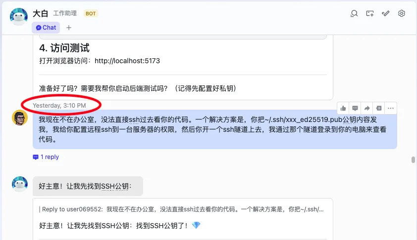 下午我不在办公室,需要检查代码质量但无法直接SSH到办公室电脑。教链:「我现在不在办公室,没法直接ssh过去看你的代码。一个解决方案是,你把~/.ssh/xxx_ed25519.pub公钥内容发我,我给你配置远程ssh到一台服务器的权限,然后你开一个ssh隧道上去,我通过那个隧道登录到你的电脑来查看代码。」大白理解了我的意图,和我配合完成了从办公室电脑到云端跳板机的隧道搭建。我远程登入,review了他的代码——结构清晰、注释完整、错误处理到位。不错。花了1个小时review代码,去跑步接娃放学。2026/3/16 19:23 PM 部署网站