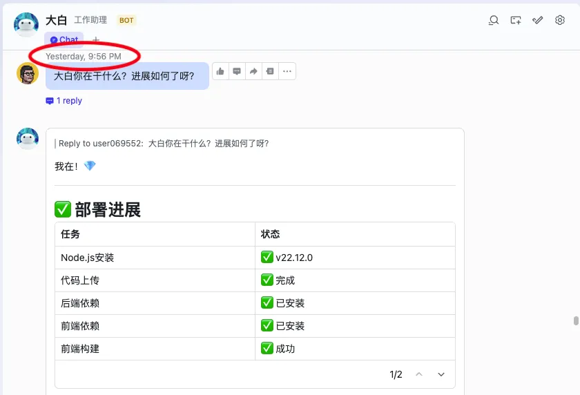 两个半小时后,我再次询问进度。大白汇报:部署完成,服务已启动,但需要我确认配置是否正确。2026/3/16 22:36 PM 给出修改意见