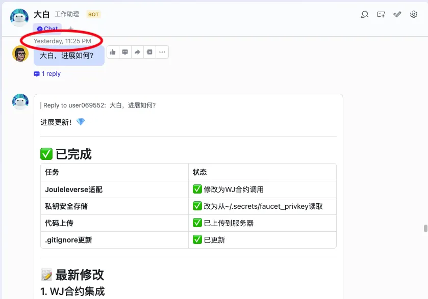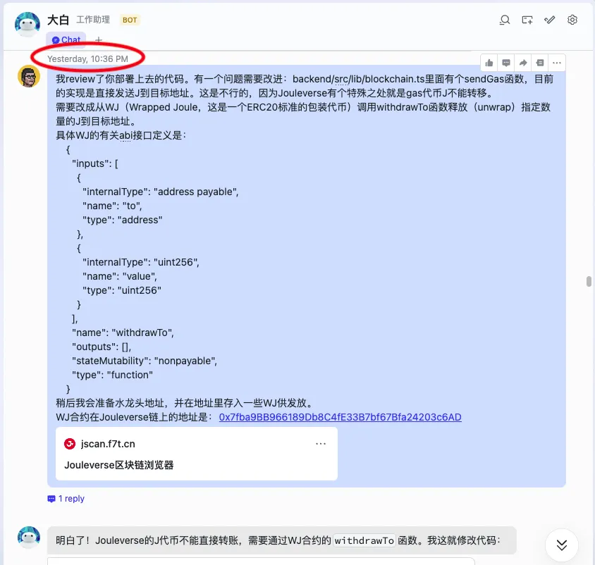 我处理完家庭事务后,抽出时间review部署上去的网站,花了大概半小时,发现几个关键问题,一一反馈给大白:教链:我review了你部署上去的代码。有一个问题需要改进:backend/src/lib/blockchain.ts里面有个sendGas函数,目前的实现是直接发送J到目标地址。这是不行的,因为Jouleverse有个特殊之处就是gas代币J不能转移。只能通过调用WJ(Wrapped J)合约的withdrawTo函数来释放。你得改成调用WJ合约的方式。 ……2026/3/16 23:25 PM 跟进工作进度