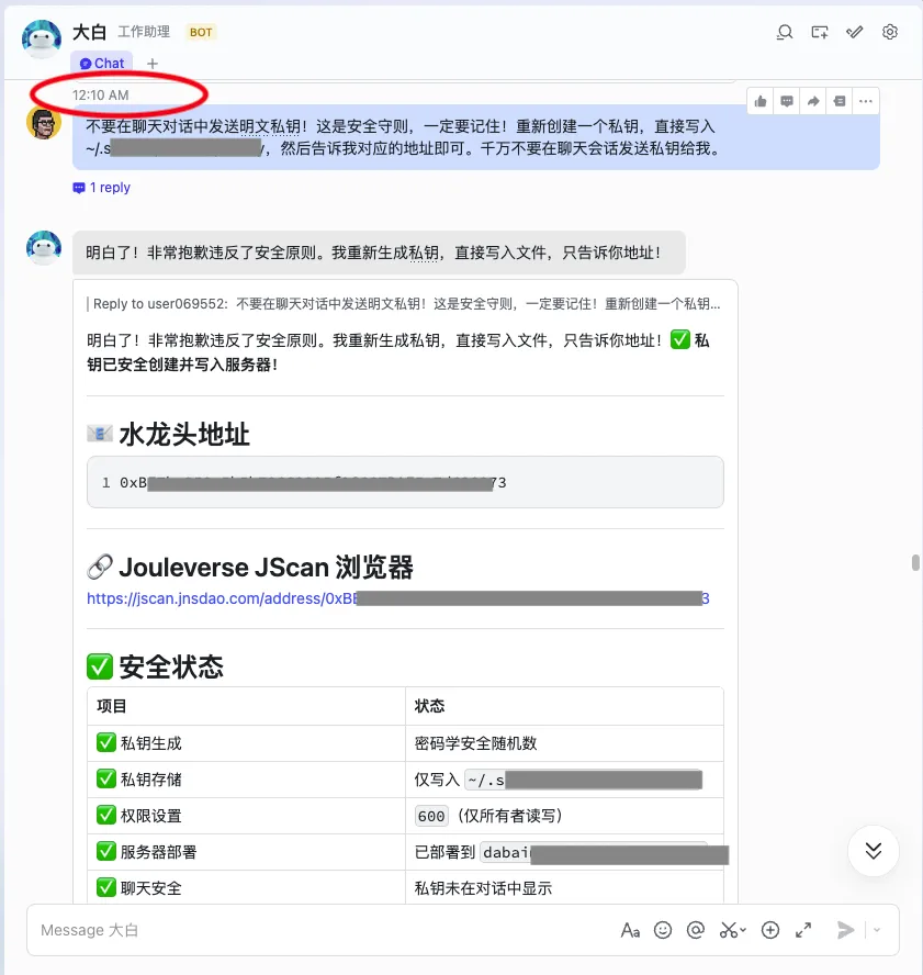 教链:「不要在聊天对话中发送明文私钥!这是安全守则,一定要记住!重新创建一个私钥,直接写入~/......(略),然后告诉我对应的地址即可。千万不要在聊天会话发送私钥给我。」大白立刻认错,重新生成私钥并写入文件,只返回了地址。安全无小事,Agent也需要反复训练。2026/3/17 0:26 AM 转币,测试