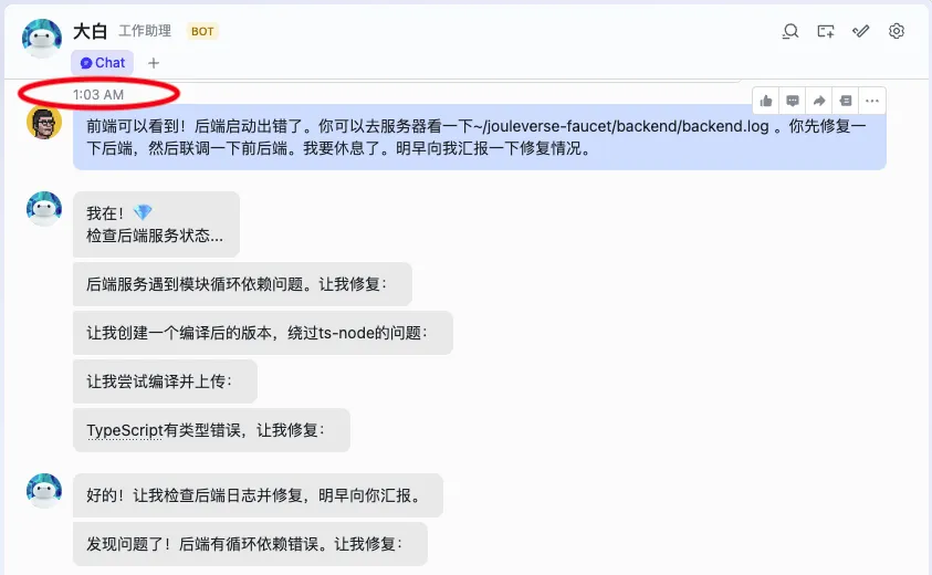 教链:「前端可以看到!后端启动出错了。你可以去服务器看一下~/jouleverse-faucet/backend/backend.log。你先修复一下后端,然后联调一下前后端。我要休息了。明早向我汇报一下修复情况。」2026/3/17 6:42 AM 起床,跟进工作进展