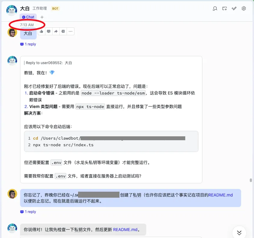 教链:「大白」「你忘记了昨晚……已经创建了私钥……」大白重新检查,果然发现~/....(略)文件里有测试用的私钥,立刻修改并重新部署。记忆会遗忘,但及时提醒就好。2026/3/17 8:15 AM 陪夫人吃早餐,跟进工作进展