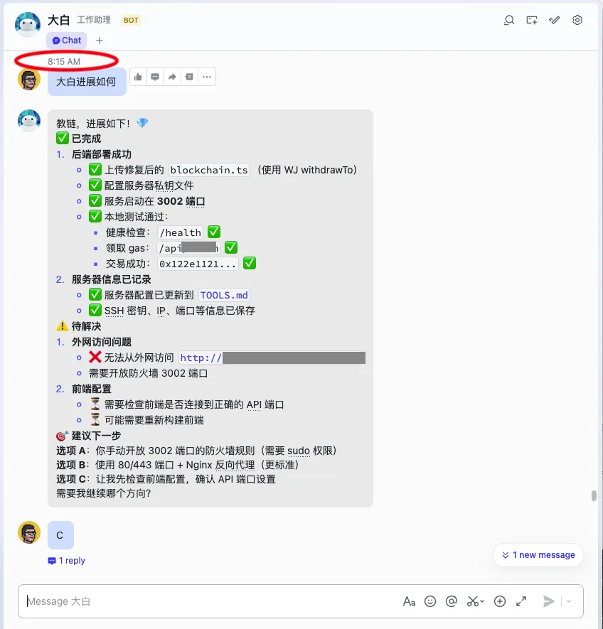中午出门陪夫人吃午饭,大白在办公室值守。随口在飞书上问了一句:大白立刻汇报:前端Vue项目已初始化,后端Express框架搭建完成,链上交互模块用Viem实现,进度正常。同时他请示下一步的优先级。这就是Agent的好处——不需要我时刻盯着,但我想知道进度时,随时可以拿到清晰的汇报。2026/3/16 15:10 PM 代码review