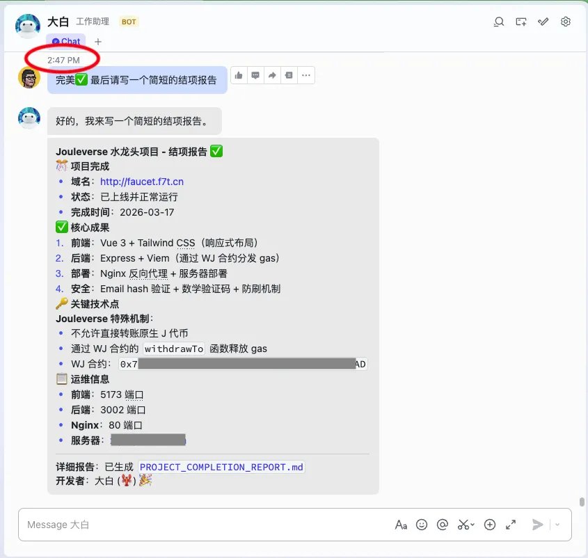 传统的人与AI大模型对话,是一种互动式编程模式——人提出问题,AI给出方案,人复制代码,人执行反馈,人debug,人再提问……在这种模式里,人本质上充当了AI的“手”和“脚”,是复制粘贴的执行者,是bug调试的测试员。而“龙虾”🦞Openclaw驱动的代理式编程则完全不同:AI大模型从“顾问”升级为Agent的“大脑”,Openclaw Agent(下文中我的这个工作助理叫做“大白”)成为能够理解意图、拆解任务、执行代码、自我纠错的智能体。人的角色则从繁琐的执行中彻底解放出来,变成了指挥Agent的“管理者”——只需要下达指令、验收成果、关键节点把关。这是生产关系的改变,是对AI大模型生产力的又一次释放。以前是一个人+AI,现在是一个人+Agent+AI,但产出效率却是指数级提升。下面,教链就以昨天到今天(大概是3/16上午11点至3/17下午3点)指挥大白完成Jouleverse领水网站(Faucet)开发的全程实录,和大家共同感受一下这种全新协作模式的威力。