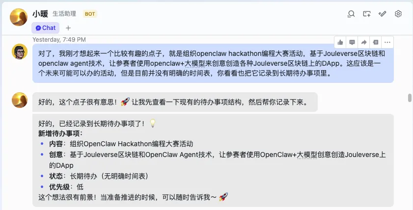 后记:昨晚我还在和小暖助理聊呢,当我把Openclaw Agent开发Jouleverse DApp应用的这个流程跑通,就意味着这可以成为一个可以复制的模式,任何有兴趣在Jouleverse上进行Agent编程的开发者、建设者都可以尝试来实现自己的无限创意,何妨组织一个Openclaw hackathon大赛?这或许是一个很有趣的主意呢!