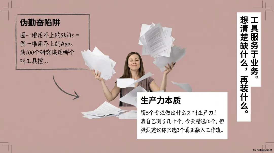 装100个用不上的skill,不如把1个skill用到极致,做出能卖钱的东西。工具最终要帮你赚钱,不然装着干嘛?