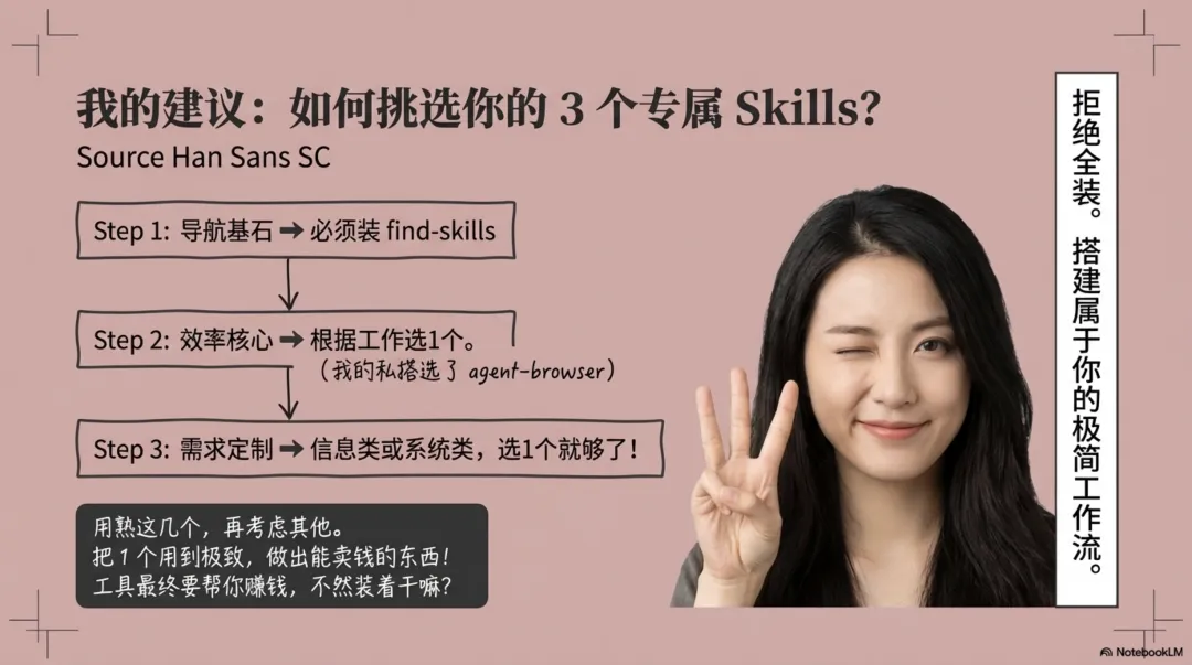 先装find-skills,这个必须有。然后根据你的工作选一个效率类的,我自己选的agent-browser。最后看需求,信息类或系统类选一个就够了。
